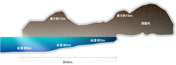 洞窟内部は高いところで約12メートルの高さがあり、水深は深いところで約6メートルあります。