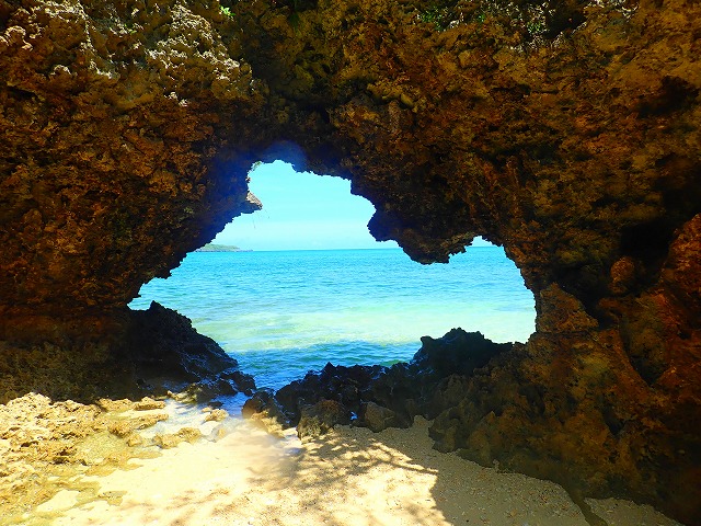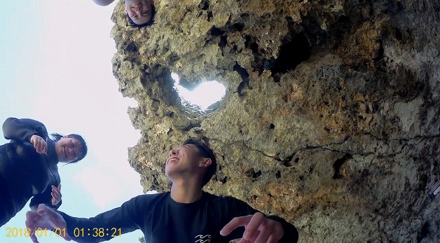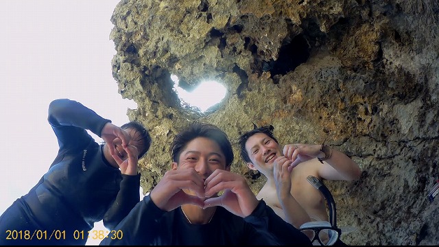 ひとのいない無人ビ~チがあるんですが、上陸してぷらぷら散策していると、岩にハ~トの形をした穴を発見して、ゲストさんとハイタッチ!!笑